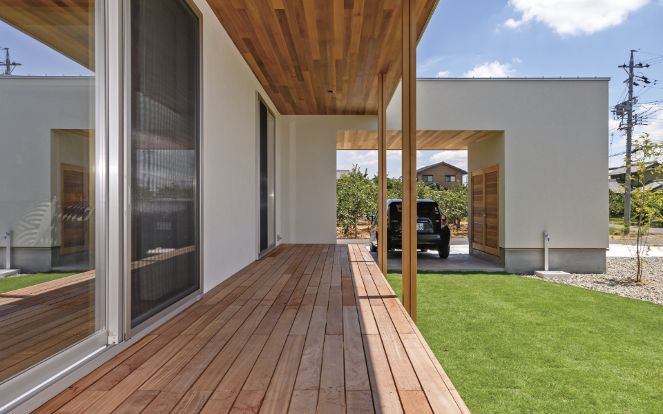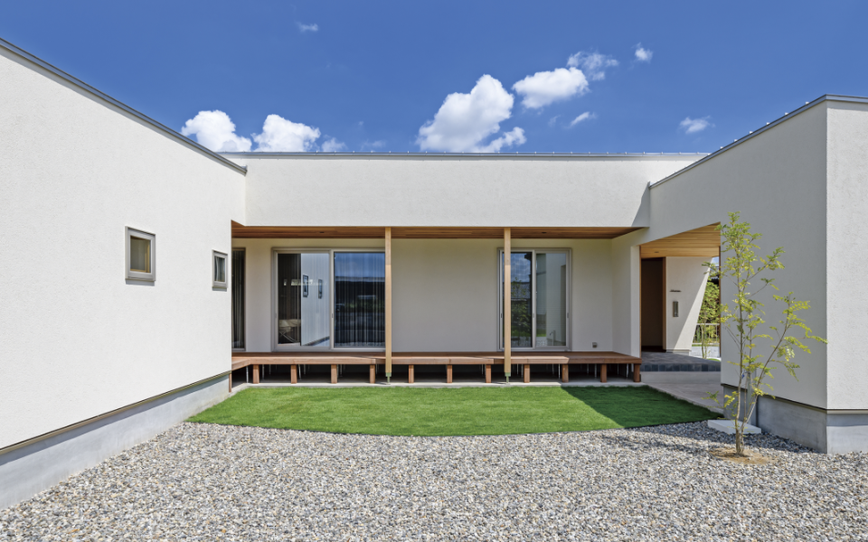 コの字型にレイアウトしたM邸。「当初設計事務所との家づくりに検討していましたが予算オーバー。チェックハウスの外部設計士さんのデザインと全館空調を採用しても予算が収まるところが決め手となりました」