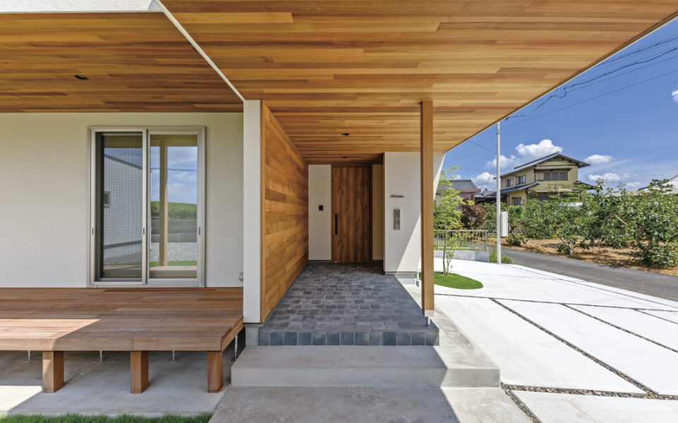 レッドシダーを使用した玄関まわり。白の壁に無垢材のの質感を活かしたこだわりのデザイン