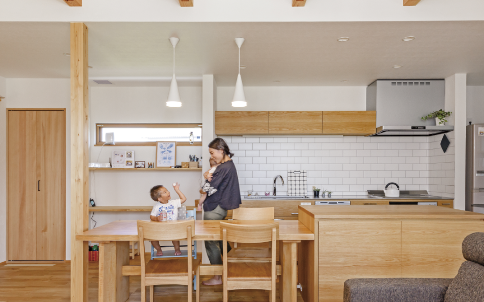 ダイニングキッチンや和室を含めると、約27帖広さ。梁を見せたことでリズムつくり、全体にすっきりとしたとしながら、面白味のある空間。キッチン左側にお子さんのスタディコーナーを設けてもらいました。