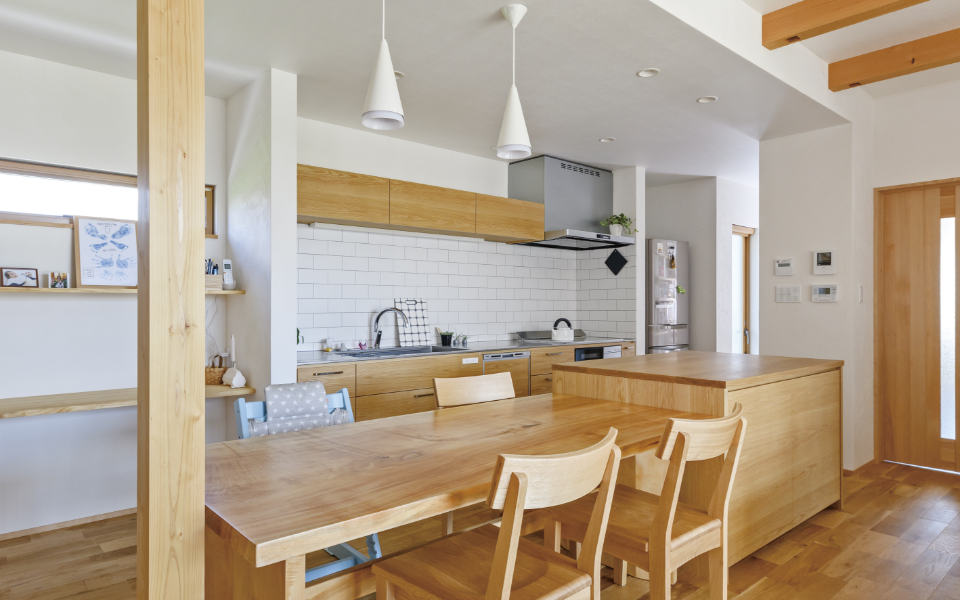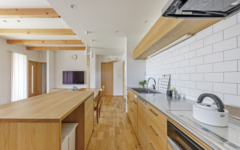 無垢の床材に合わせたキッチンも、オークでオーダーメイド。「オープンスタイルにすることで、子どもに料理している様子を見せるキッチン空間になりました」