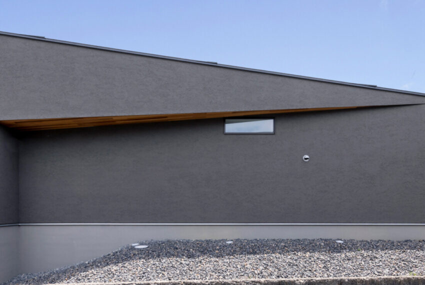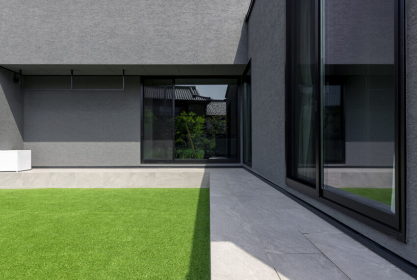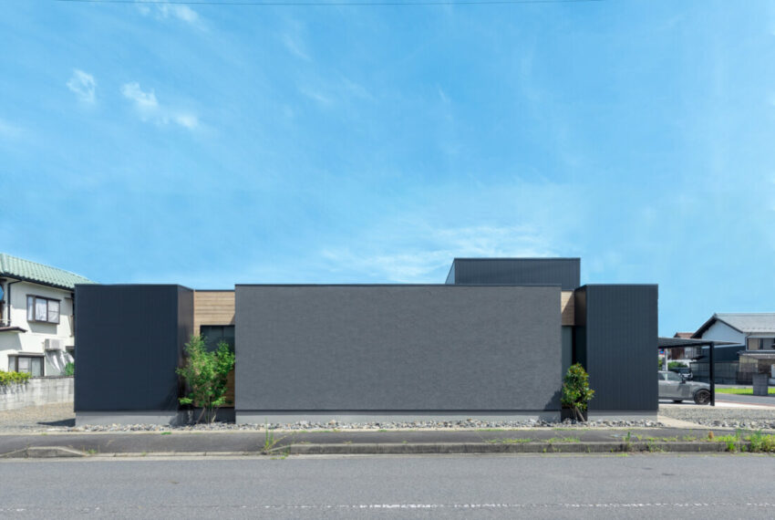 - インナーガレージ付きプライベート中庭のグレーの平屋